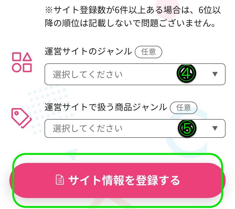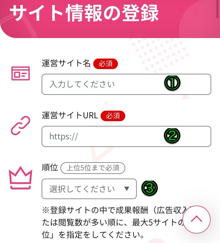 | 順位(上位5位まで必須) | 複数サイトを登録する場合、どれがメインかを示す数値 |